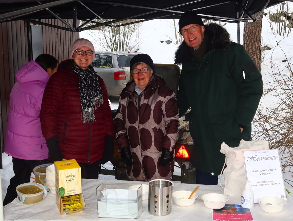 Laskiaissunnuntaina 19.2.2023 Kulosaaren kirkon pihalla nautittiin herkullisesta kasvishernekeitosta ja seurakuntasalin puolella laskiaispullista. Perheen pienimmille oli sisällä askartelua. Lumi sai iloiset ilmeet tulijoiden kasvoille. Eikä tätäkään hauskuutta olisi voinut tehdä ilman kulosaarelaisia aktiiveja ja Meripartiolaisia.